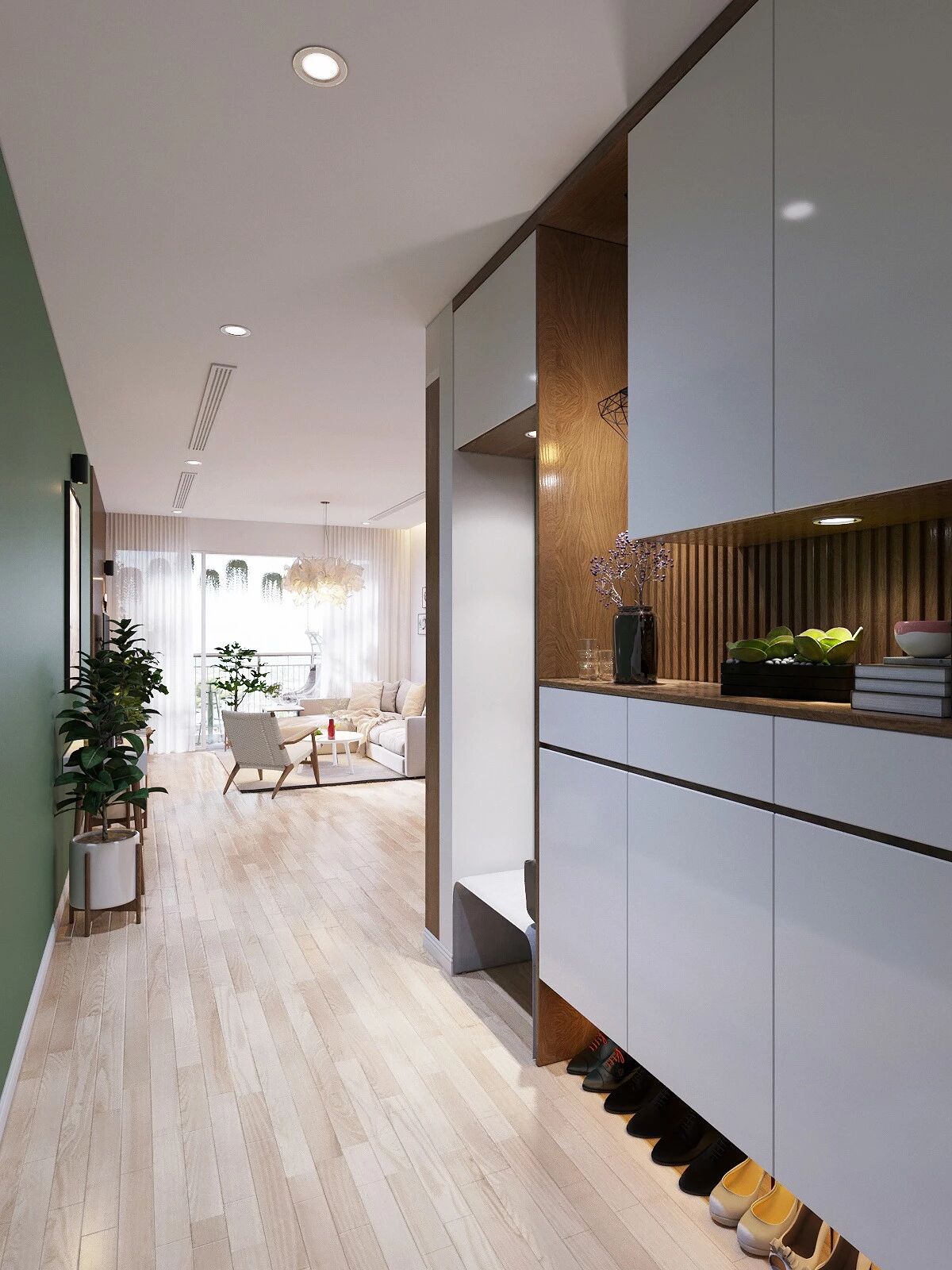 今年鞋柜底部留空非常流行,因为这样的设计对于日常使用体验非常好,进出门可以将换下来的鞋子,直接放入鞋柜底部,不用打开柜门。