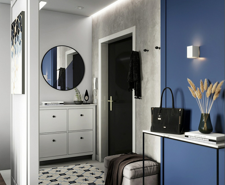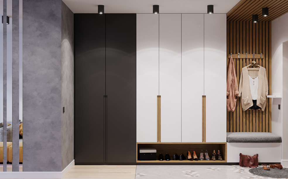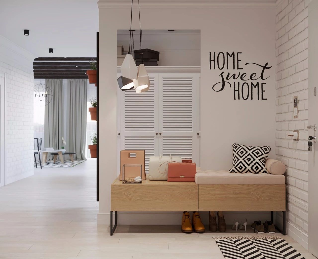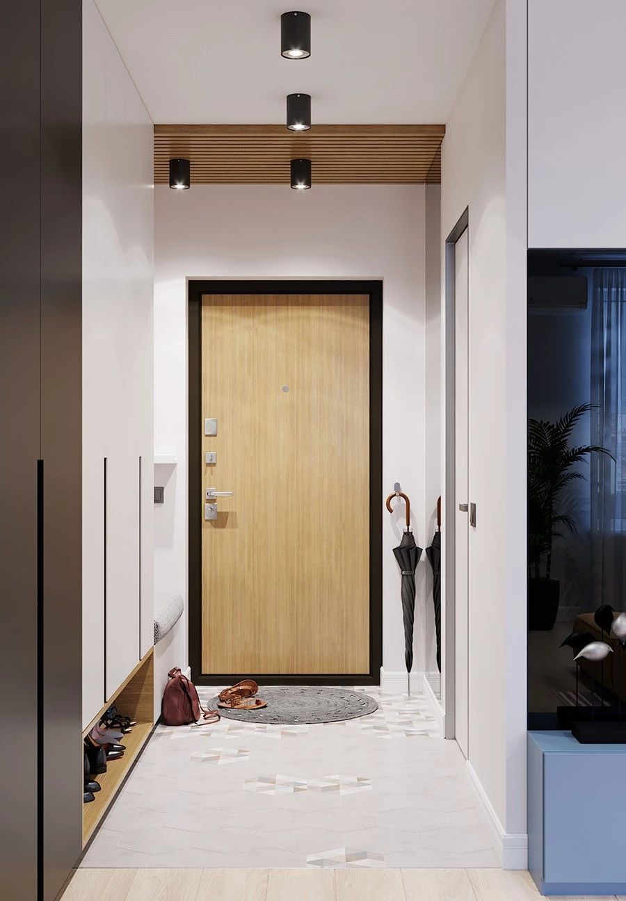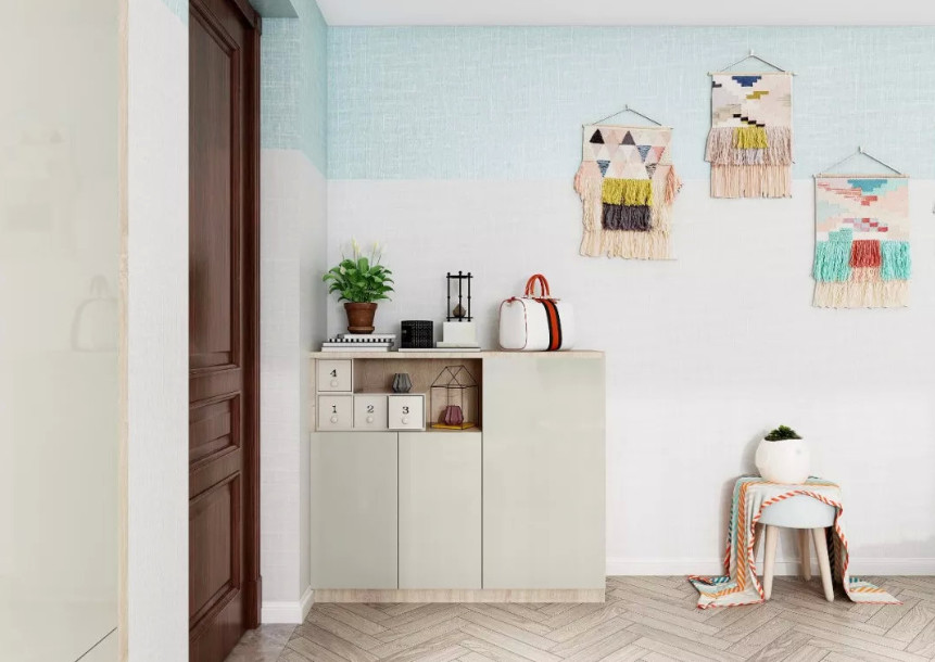 面积在100㎡以下的房子,很难有独立的门厅鞋柜,如果面积有限,可以在入门处放一个比较节省空间的鞋柜,比较实用,很受业主们的欢迎。