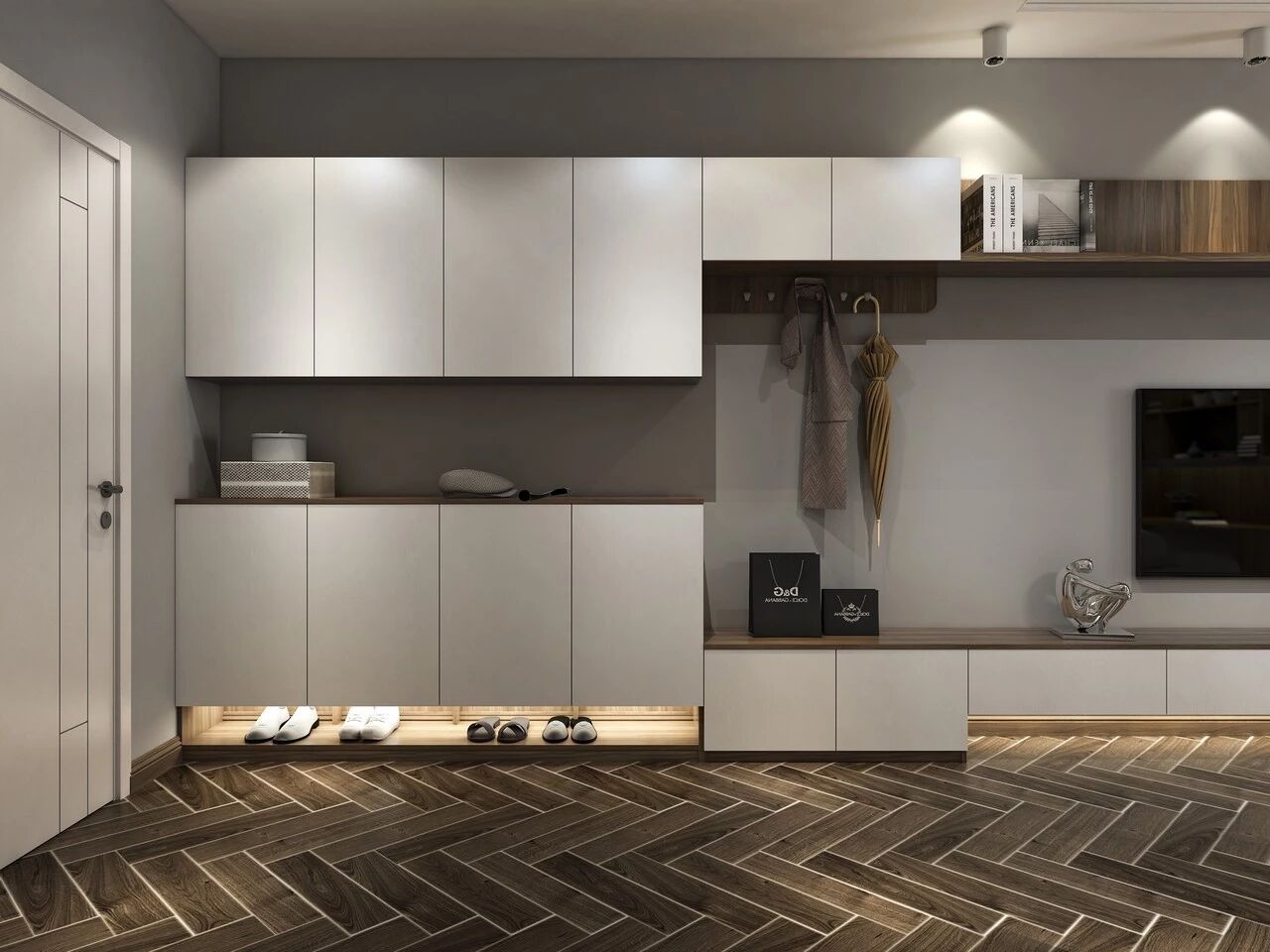 我们还可以在鞋柜底部安装感应灯,方便快捷又省电。